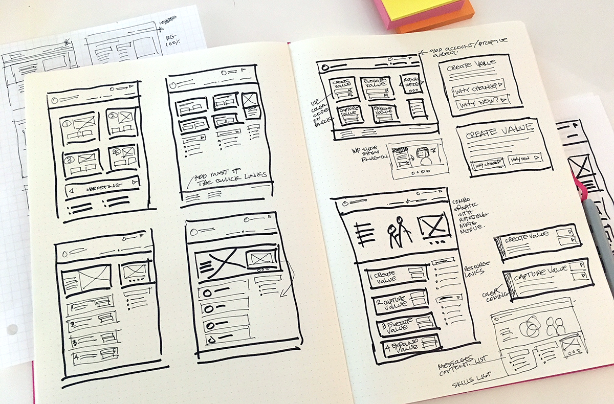 In order to stay within budget, the client took my recommendations and returned a revised set of wireframes from which started freehand sketching to quickly map out the main areas of content based on hierarchy. I moved to the Sketch app and rendered a first draft of two directions – one that hewed closely to the wireframes, and another that highlighted the same content while also giving the portal a visual sense of place and the ability to keep the content updated and fresh. All of the mockups were reviewed on Invision.